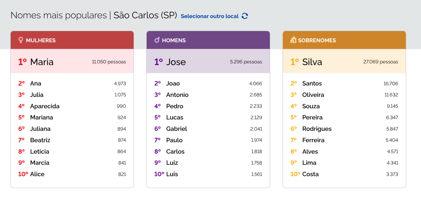 Fonte: São Carlos Agora. Leia o artigo original: Confira nomes e sobrenomes mais comuns em São Carlos, segundo o IBGE